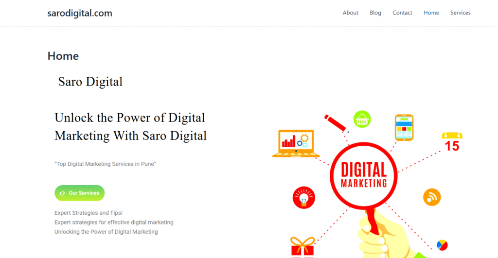 At Saro Digital , we help your business thrive in the digital world by offering result-driven digital marketing solutions tailored to your goals. Whether you’re looking to grow your brand, attract more customers, or drive online sales, our strategic approach ensures that your efforts deliver maximum impact. We’re proud to support businesses through our digital marketing services in Pune and beyond.